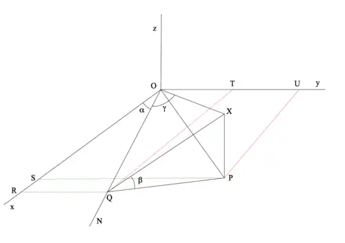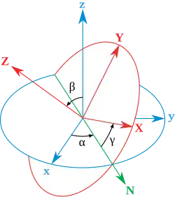 Gegeven zijn twee rechtshandige orthonormale assenstelsels, traditioneel aangeduid met Oxyz en OXYZ. De lijn N is de snijlijn van de vlakken Oxy en OXY.