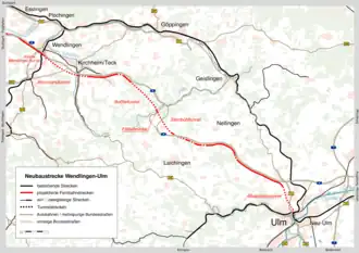 Vanuit Ulm Hbf loopt de bestaande spoorlijn door naar het in 2007 grootschalig verbouwde station Neu-Ulm (in de stad Neu-Ulm) dat in de toekomst aansluiting moet gaan geven op een geplande hogesnelheidslijn Ulm-Augsburg.