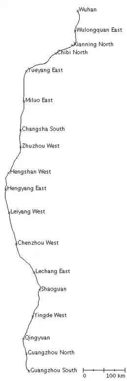 De lijn is een sectie van de langere hogesnelheidslijn Peking-Hongkong die Peking (Beijing) met Shenzen en Hongkong verbindt. Het gedeelte Wuhan-Guangzhou heeft een totale lengte van 968 kilometer. Het traject wordt afgelegd in minder dan drie uur. Daarmee werd de lijn in 2009 wereldwijd de hogesnelheidslijn met de hoogste gemiddelde snelheid en was het eveneens het langste hogesnelheidslijntraject. Op de lijn worden maximumsnelheden van 394 kilometer per uur gehaald. De aanleg van de spoorweg begon op 23 juni 2005, de eerste commerciële treinrit vertrok op 26 december 2009.