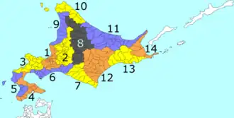 1. Ishikari, 2. Sorachi, 3. Shiribeshi, 4. Oshima, 5. Hiyama, 6. Iburi, 7. Hidaka, 8. Kamikawa, 9. Rumoi, 10. Soya, 11. Abashiri, 12. Tokachi, 13. Kushiro, 14. Nemuro