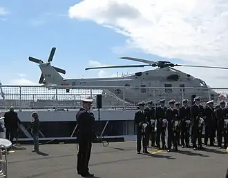 De hangar heeft ruimte voor een boordhelikopter van het type NH90 NFH. Onder het helikopterdek kunnen enkele containers met hulpgoederen geplaatst worden. Een lift daarvoor is aanwezig.