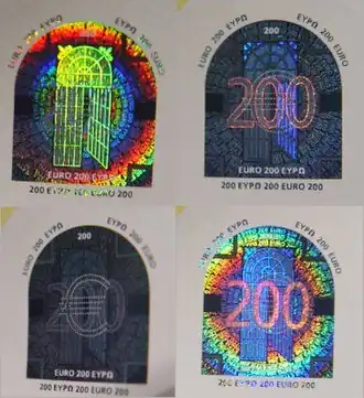 Hologrammen worden veelvuldig toegepast om de echtheid van een object te waarborgen. Zo komen hologrammen voor op bankpasjes, bankbiljetten, softwareverpakkingen enz. Deze methode wordt toegepast omdat hologrammen moeilijk na te maken zijn.