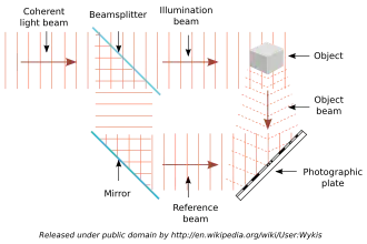 Holografie (Oudgrieks: ὅλος, hólos = volledig en γράφειν, gráphein = schrijven) is een techniek om een driedimensionale afbeelding van een object te maken, met gebruik van een plat vlak in de vorm van een fotografische film of sensor, of een ingegraveerde structuur. Door de afbeelding uit verschillende hoeken te bekijken lijkt het platte beeld te veranderen zodat de indruk van een ruimtelijk, driedimensionaal beeld bestaat. Het beeld bestaat echter niet echt maar wordt gerepresenteerd door plaatsen waar licht aanwezig is en door plaatsen waar minder of geen licht aanwezig is. Het resultaat kan alleen vanuit een beperkte hoek worden waargenomen. Zie de foto’s, die dit laatste illustreren. Door de breking van het (witte) licht zijn in deze afbeeldingen veelal de kleuren van de regenboog zichtbaar.