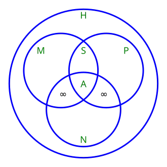 Merk op dat: (M ∩ P) = S, (S ∩ N) = A, (M ∩ N) \ A en (P ∩ N) \ A alleen homomorfismen van oneindige algebraïsche structuren naar zichzelf bevatten.