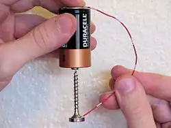 De magneet hoeft geen stroom te geleiden en hoeft ook niet mee te draaien. De magneet kan op de batterij worden vastgeklikt en de geleider gaat draaien als de stroomkring gesloten wordt. De geleider moet ergens niet evenwijdig lopen aan het magnetisch veld, wil er een lorentzkracht optreden. Deze staat haaks op zowel de elektrische stroomrichting als het magnetisch veld en veroorzaakt een koppel dat de geleider laat draaien.[1]