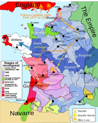 - Slag bij La Rochelle (1372): de Castiliaanse vloot, een bondgenoot van Frankrijk, vernietigt de Engelse vloot. Deze nederlaag berooft de Engelsen van hun logistieke ondersteuning op het continent. De Fransen verdreven hen geleidelijk aan terwijl ze een voor een bijna al hun bolwerken heroverden.