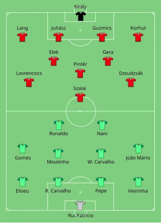 Dankzij het onderling resultaat tegen Oostenrijk en ontwikkelingen in andere poules, wist Hongarije een dag voor aanvang van de derde groepswedstrijd al dat het in ieder geval doorging naar de achtste finales. Afhankelijk van de uitslag tegen het nog niet geplaatste Portugal, kon dat alleen nog als groepswinnaar, nummer twee of als een van de vier beste nummers drie van het toernooi gebeuren. Het werd 3-3. Hongarije kwam drie keer voor en Portugal maakte drie keer gelijk. De eerste voorsprong kwam er in de 19e minuut. Cristiano Ronaldo kopte een corner van Balázs Dzsudzsák weg, waarna Nani de bal met het hoofd verlengde. Hierdoor kwam die voor de voeten van Zoltán Gera, die de bal van buiten het strafschopgebied in de rechterbenedenhoek schoot. Nani maakte een paar minuten voor rust gelijk. Hij verscheen op aangeven van Ronaldo links voor het Hongaarse doel op en passeerde Király in de korte hoek. Dzsudzsák zette Hongarije in de 47e minuut op 2-1. Hij nam een vrije trap rechts voor het Portugese doel, die via de bovenarm van verdediger André Gomes voorbij doelman Rui Patrício ging. Ronaldo maakte drie minuten later weer gelijk. Na een voorzet van João Mário tikte hij de bal met zijn rechterhak achter zijn standbeen langs in het Hongaarse doel. De 3-2 voor Hongarije begon opnieuw bij een vrije trap van Dzsudzsák. Die schoot hij ditmaal eerst tegen Ronaldo aan, maar de bal stuitte terug voor zijn voeten. Zijn tweede schot ging deze keer via het been van Nani het Portugese doel in. Het laatste doelpunt kwam opnieuw op naam van Ronaldo, die in de 62e minuut een voorzet van links van invaller Ricardo Quaresma inkopte. Door dit gelijkspel bleef Hongarije IJsland op basis van het onderlinge resultaat voor en won het groep F.