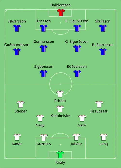 Hongarije won het eerste groepsduel met 2-0 van Oostenrijk. Ádám Szalai kwam na een pass van László Kleinheisler in de 62e minuut alleen voor doelman Robert Almer te staan en schoot vandaaruit de 1-0 binnen. Vier minuten later kreeg Aleksandar Dragović zijn tweede gele kaart na doorgaan op Tamás Kádár en moest Oostenrijk met tien man verder. Vlak voor tijd maakte invaller Zoltán Stieber 2-0. Nadat de eveneens ingevallen Tamás Priskin hem in een counter richting het Oostenrijks strafschopgebied stuurde, stifte hij de bal over Almer. Doelman Gábor Király werd tijdens deze wedstrijd de oudste speler ooit op een EK. Hij begon die dag op een leeftijd van 40 jaar en 74 dagen aan het duel en onttroonde daarmee Lothar Matthäus als recordhouder. Hongarije speelde vier dagen later met 1-1 gelijk tegen IJsland. De IJslanders kwamen in de 39e minuut op voorsprong nadat het Király niet lukte om een hoekschop van Jóhann Berg Guðmundsson vast te houden. Ragnar Sigurðsson kopte de bal daarop voor de voeten van Aron Gunnarsson, waarna Tamás Kádár die neerlegde en een strafschop veroorzaakte. Gylfi Sigurðsson verzilverde de penalty. Drie minuten voor tijd kwam de eindstand op het bord. Nemanja Nikolić gaf een voorzet van rechts. Birkir Már Sævarsson probeerde de bal te onderscheppen voor invaller Dániel Böde erbij kon, maar werkte die daarbij in eigen doel.