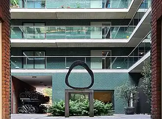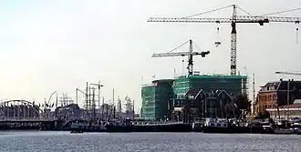 In de visie van Coenen paste een bebouwing met forse, gesloten woonblokken met binnenhoven, zgn. 'superblokken', gelegen aan een boulevard-achtige hoofdstraat, de KNSM-laan.[6] Het eerste, 170 m lange superblok, Barcelona, werd in 1993 opgeleverd; Piraeus volgde een jaar later. Voor de kop van de Verbindingsdam werd gedacht aan een derde superblok, dat echter vanwege de bereikbaarheid 'doorwaadbaar' moest zijn. Voor dit project werd in 1995 een prijsvraag uitgeschreven, waarvoor op voorstel van Coenen vier architectenbureaus werden uitgenodigd: MBM Arquitectes uit Barcelona, Rudy Uytenhaak (Amsterdam), Luigi Snozzi en Diener & Diener, beide uit Zwitserland.[7] Waar Uytenhaak en MBM kozen voor een letterlijke interpretatie van de opdracht om een poortgebouw te creëren, kozen de Zwitserse bureaus voor losse volumes; bij Snozzi drie, bij Diener & Diener twee aparte gebouwen.[8] Dit laatste plan kwam eind 1995 als winnaar uit de bus.[9] In maart 1999 begon de bouw van Hoogkade; in november van dat jaar volgde Hoogwerf.[10] De oplevering vond plaats in 2001.[11]