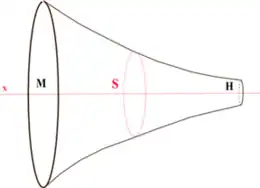 De kleinste opening of aanvangsopening van een hoorn wordt de hals (H) of keel genoemd en de grotere uittreeopening de mond (M). De rechte tussen het midden van de hals en de mond noemt men de hoornas (x) en de afstand tussen hals en mond op deze as is de hoornlengte. Van hals tot mond varieert het oppervlak van de doorsnede (S) volgens een bepaalde wet in functie van de afstand tot de hals. Deze wet kan cilindrisch (constante doorsnede), parabolisch, conisch, exponentieel, hyperbolisch zijn of een ander toenemend verloop hebben. In praktische ontwerpen is de akoestische koppeling van de hals met de geluidsbron van groot belang. Om de stralingsimpedantie zo veel mogelijk resistief (onafhankelijk van de frequentie) te maken, moet tevens de omtrek van de mond groter zijn dan de golflengte van de laagste toon die de hoorn moet uitstralen. Dit betekent dan ook dat de lengte voldoende groot moet zijn.