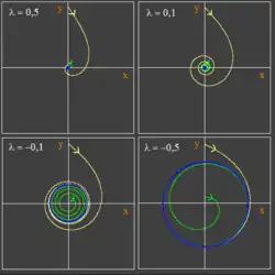 Voor is de Hopf-bifurcatie superkritisch. Voor heeft het systeem dan één stabiel evenwichtspunt bij . Vanuit elke begintoestand zal het systeem naar dit evenwicht convergeren. Voor wordt dit evenwichtspunt onstabiel. Tegelijkertijd ontstaat er een stabiele periodische oplossing op een cirkel met straal . Nu zal het systeem vanuit elke begintoestand naar deze oplossing convergeren: het systeem oscilleert. Deze bifurcatie vindt weer plaats bij .