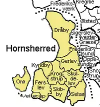 Horns omvatte oorspronkelijk tien parochies. Orø ging in 1933 over naar Tuse Herred in Holbæk Amt.