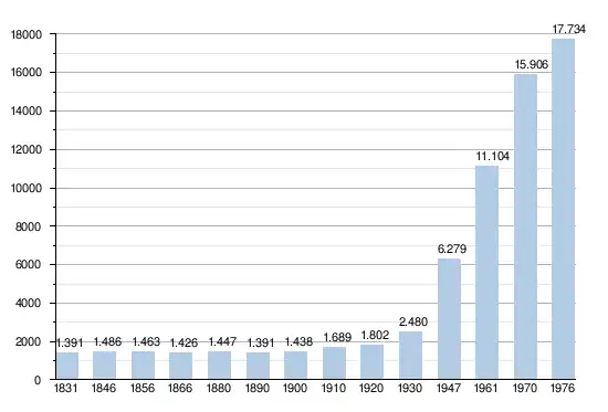 - Bronnen:NIS, Opm:1831 tot en met 1970=volkstellingen; 1976 = inwoneraantal op 31 december