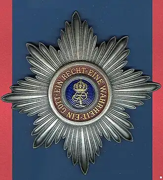 • De ster is van zilver, in en enkel geval van goud, en heeft achttien stralen. De diameter is 10½ centimeter en de zilveren ster is iets gewelfd. De lancetvormige stralen zijn fraai bewerkt met een parelrand en zodanig geplaatst dat de ster acht punten heeft. In het midden van de ster is een groot medaillon, gelijk aan dat van het kleinood, geplaatst. In het geval van een verlening van een grootkruis of een grootcommandeurskruis met de zwaarden worden twee ontblote zilveren zwaarden met gouden gevesten op de diagonale stralen gelegd. De ster van de grootkruisen werd op de linkerborst gedragen terwijl de grootcommandeurs een ster op de rechterborst droegen. Er zijn sterren bekend die met diamanten werden bezet. Dergelijke onderscheidingen met briljanten werden incidenteel aan staatshoofden of bij wijze van kostbaar geschenk verleend. Zij kunnen niet worden gezien als een graad in de orde.