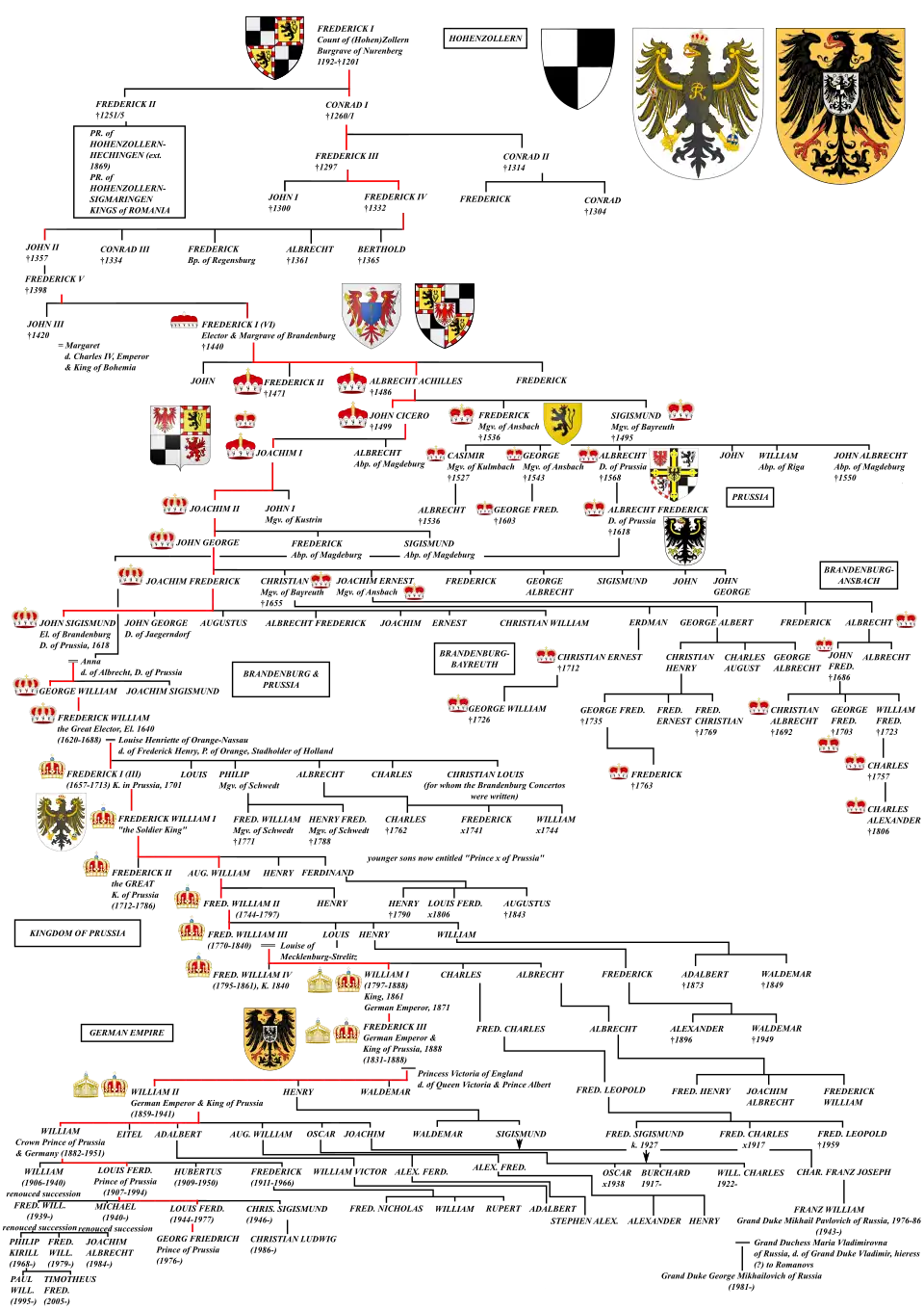 Frederik II de Grote, de eerste koning van Pruisen, was een van de belangrijkste vorsten van de 18e eeuw. Koning Wilhelm I bereikte in 1871 de keizerlijke waardigheid met het tot stand komen van het Duitse Keizerrijk. Zijn kleinzoon Wilhelm II, de laatste regerende vorst uit deze tak van de Hohenzollern, moest in 1918 aftreden. Dit deed hij in het kasteel Amerongen in de Nederlandse provincie Utrecht waar hij tijdelijk onderdak had gevonden na de vlucht uit Duitsland.