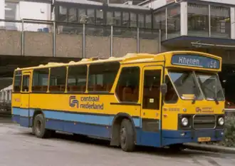 Gele basis met een lichtblauwe lijn rondom de bus. Dit is oorspronkelijk de huisstijl van Centraal Nederland waarbij slechts het logo is vervangen. -