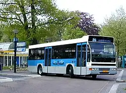 Huisstijl van de stadsbussen in de jaren 90. De bussen hadden een witte basis met verkeersblauwe schotplaten en verkeersrode deuren. -