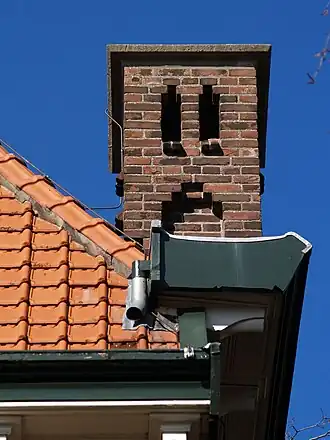 Links naast de risaliet bevindt zich een houten erker met veel glas, voorzien van tuile-du-nordpannen. Alle dakpannen zijn van hetzelfde type, en rood/oranje van kleur. De eindpannen van de windveer van de dakkapellen hebben een krul als sierelement zoals je ook ziet op ionische zuilen. De woning heeft door zijn samenstelling meerdere daken. Zichtbaar zijn de twee schilddaken die afgesloten worden door pirons. De daken worden aan de onderzijde afgesloten met dakgoten die gedragen worden door klossen met een profiel.