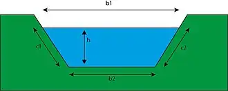 - P: de natte omtrek (Perimeter). Dit is de omtrek van het natte deel, maar alleen dat deel dat raakt aan bodem of oever. Zie ook Natte omtrek