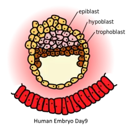 Menselijk embryo op dag 9 na de bevruchting. Hypoblast (bruin) zit onder de epiblast (roze)