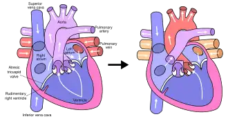 Bij de geboorte is de ductus arteriosus nog open en is er een hogere dan normale weerstand tegen de bloedstroom in de longen. Dit zorgt voor voldoende zuurstofvoorziening via menging tussen de atria en een normaal uiterlijk van de baby bij de geboorte. Wanneer de ductus arteriosus begint te sluiten en de pulmonale vasculaire weerstand afneemt, wordt de bloedstroom door de ductus arteriosus beperkt en neemt de stroom naar de longen toe.[3]