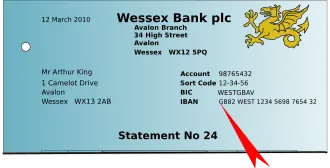 Voorbeeld (fictieve Britse bank met bankcode WEST en filiaalcode 12-34-56, rekeningnummer 98765432 - zie rechts):