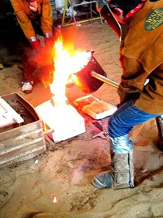 • In een smeltoven, zoals een koepeloven, wordt een hoeveelheid ruwijzer, schroot en eventueel wat ijzererts gestapeld, tezamen met gietcokes en de toeslagstof kalksteen. Het geheel wordt tot smelten gebracht waarbij de cokes als brandstof dient. De toeslag bindt zich met de verontreinigingen tot slak. Indien een elektrische oven wordt toegepast vervalt de cokes.