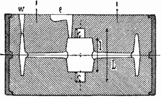 Doorsnede door een gietvorm met gietlopen en stijgers