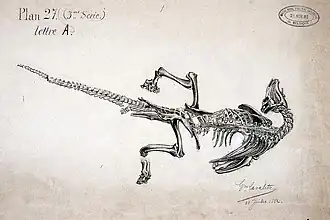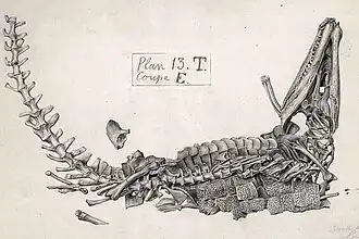 "Onvolledig geraamte. Dit specimen ligt op zijn linkerzijde met de voorste en achterste ledematen uitgespreid en samengevoegd. Het vertoont een hals die zeer sterk naar achteren samengetrokken is, wat er misschien op wijst dat het dier minder vreedzaam is omgekomen dan dit bovenaan in 't midden en misschien veel sneller begraven werd na zijn dood."