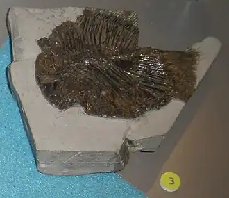 - De Barremien/Aptien kleisteen van Bernissart bevat overvloedige concentraties pyriet, een algemeen product van diagenetische fixatie[66] van waterstofsulfide in sedimenten. Ook de gevonden beenderen van Iguanodon bernissartensis bevatten grote hoeveelheden pyriet.