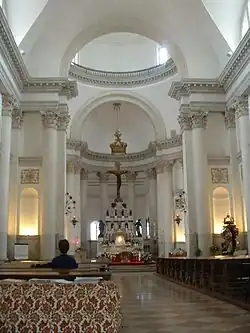 De kerk heeft een hoge koepel. Er staan beelden boven de ingang. In de kerk zijn zuilen van de Korinthische orde.