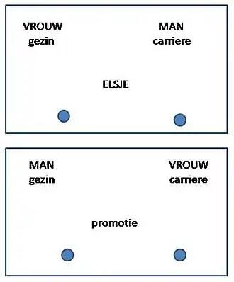 - In serie A moet met eenzelfde hand worden gereageerd op bijvoorbeeld ‘bloemen’ en ‘prettige woorden’ en met de andere hand op ‘insecten’ en ‘onprettige woorden’, Dit wordt ook wel de compatibele of de congruente conditie genoemd, omdat de woorden intuïtief bij elkaar lijken te horen. 'Bloemen' of 'prettige woorden' staan bijvoorbeeld links, en 'insecten' of 'onprettige woorden' rechts op de dia. Of: 'vrouw' en 'gezin' links en 'man' en 'carrière' rechts.
