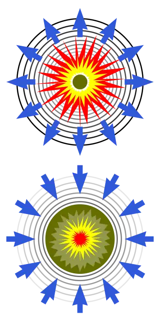 Door de implosie valt het materiaal naar binnen. Door de grote snelheid die de brokken verkrijgen, vliegen ze rechtuit door, zodat de brokken toch alle kanten opvliegen, zoals bij een explosie het geval is.