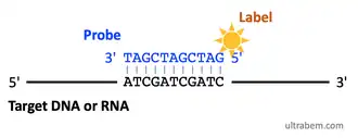 - Probeconstructie: Verschillende soorten probes zoals cDNA, cRNA (complementair RNA) en synthetische oligonucleotiden worden gebruikt voor in-situhybridisatie. De keuze van de probe zal afhangen van de gevoeligheid en specificiteit, het productiegemak, het gemak waarmee de probe het weefsel kan penetreren, de toepassing en de reproduceerbaarheid van de werkwijze. De optimale probegrootte is 50-300 nucleotiden.[6]