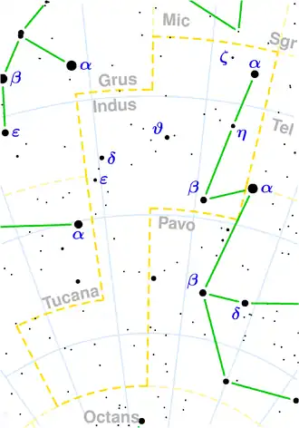 Het sterrenbeeld heeft geen heldere sterren, de helderste, alpha Indi, heeft magnitude 3,11.