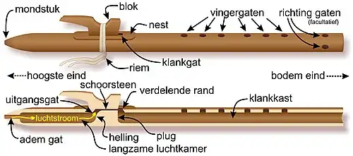 De Indiaans-Amerikaanse fluit heeft twee luchtkamers. Er is een houten middenstuk in de fluit tussen de bovenste (langzame) luchtkamer en de onderste kamer die de fluit en de gaten bevat. De bovenste kamer dient ook als een tweede resonator, die de fluit zijn typerende geluid geeft. Er is een gat in de bodem van de "langzame" luchtkamer en een (meestal) vierkant gat bovenaan de luchtkamer waarmee de fluit wordt bespeeld. Een blok hout gemaakt in de vorm van een dier (of "fetisj") is aan de bovenkant van de fluit geknoopt. Binnenin de speelkamer komen de wanden van de fluit naar beneden gezien steeds dichter bij elkaar.