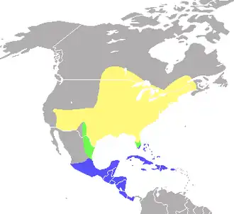 | Verspreidingsgebied (geel=zomer; blauw=winter; groen=jaarrond) van de indigogors | |||||||||||||