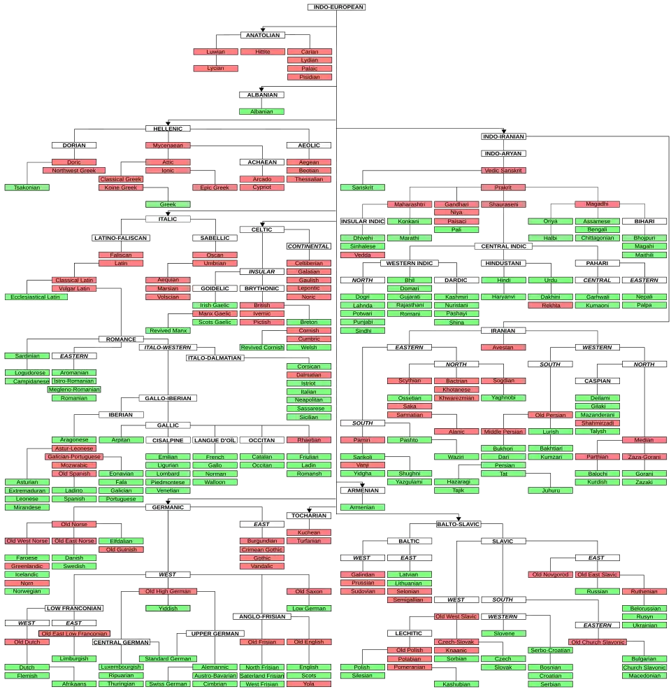 - ↑ Geisler, Hans and Johann-Mattis List. 'Beautiful trees on unstable ground. Notes on the data problem in exicostatistics. In Heinrich Hettrich (ed.), ''Die Ausbreitung des Indogermanischen. Thesen aus Sprachwissenschaft, Archäologie und Genetik''. Wiesbaden: Reichert. Het diagram verscheen ook in Pereltsvaig, Asya & Martin W. Lewis. ''The Indo-European Controversy. Facts and Fallacies in Historical Linguistics''. Cambridge: Cambridge University Press, 2015, Appendix.