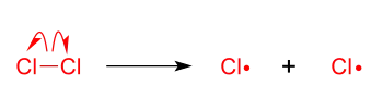 - De reactie van chloor met alkanen volgens een radicaalmechanisme wordt op gang gebracht door ultraviolette straling; de initiatiestap is de dissociatie (homolyse), van een chloormolecuul. (zie ook radicalaire halogenering)[2]: