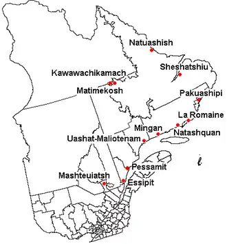 - Natashquan - Het reservaat Natashquan ligt aan de monding van de gelijknamige rivier in de Saint Lawrence, 336 km oost van Sept-Îles. Het reservaat meet ca. 20 ha, de bevolking bedraagt 1.118 personen.[32]