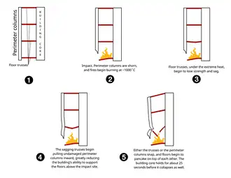 - De buitenmuren begonnen te knikken (Engels: buckle) onder de gecombineerde krachten van de verzakte vloeren, de brand en de verwoeste kernkolommen door vliegtuigschade.