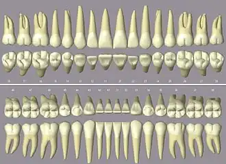 Bij het voorstellen in schema's worden de tanden voorgesteld zoals de tandarts ze ziet, dus rechts en links verwisseld. De tandarts noemt de cijfers meestal een voor een, dus niet "achtendertig" maar "drie acht".
