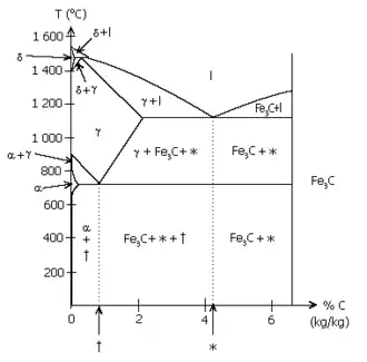 Bij hogere koolstofconcentraties treden faseovergangen op, zoals weergegeven in het fasediagram rechts. Als gietijzer meer dan 6,67 gewichtsprocent koolstof bevat, dan valt de legering in stukken cementiet uit elkaar, die door door lagen grafiet zijn gescheiden. Boven de 6,67 gewichtsprocent koolstof treedt verzadiging met koolstof op, omdat het thermodynamisch gunstiger is om twee aparte fasen met cementiet en grafiet te vormen.