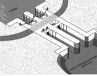 Op 25 oktober 1914 beslist het GHK (Groot Hoofdkwartier) weerstand te bieden achter de spoorweg Diksmuide-Nieuwpoort. Karel Cogge, een opzichter van de Noordwatering Veurne (NWV), wordt op het stadhuis van Veurne ontboden om de mogelijkheid te bespreken het deel van de IJzervlakte tussen de IJzer en de spoorweg te inunderen. Karel Cogge bevestigt dat het plan dat kapitein Nuyten opgevat had, uitvoerbaar is mits een aantal werken uit te voeren. Hij stelt voor de overlaat van Veurne-Ambacht (de overlaat op de Noordvaart) van het sluizencomplex te gebruiken om het zeewater toegang te geven tot de polder. Het plan wordt goedgekeurd en orders worden gegeven voor het dichten van een dertigtal duikers onder de spoorwegberm om die om te vormen tot een dijk.