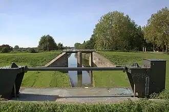 - In 1870 werd in Wijk bij Duurstede een 350 meter lang en 30 meter breed inundatiekanaal gegraven en een inundatiesluis gebouwd in de dijk van de Nederrijn.[3] Het water stroomt via het korte kanaal naar de Kromme Rijn om het gebied ten zuiden en zuidoosten van Utrecht onder water te kunnen zetten. De militaire functie is reeds vervallen, maar nog altijd doen sluis en kanaal dienst om het water in de grachten van Utrecht door te spoelen.