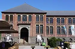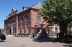 L-vormig gebouw met hoofdburelen in zakelijke stijl aan de vroegere ingang |
