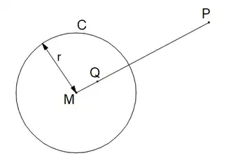- Constructie van de inverse P van een punt Q in het uitwendige van C: