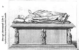 Detail van het grafmonument met beschadigingen door beeldenstormers