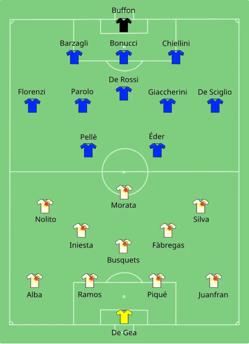 De Italianen namen het in hun achtste finale op tegen titelverdediger Spanje, de nummer twee van groep D. Daarmee verschenen dezelfde twee ploegen op het veld als tijdens de finale van het EK 2012. Italië nam in de 33e minuut de leiding. Éder schoot een vrije trap voor het doel van Spanje recht door het midden tegen doelman David de Gea aan. Die liet de bal los, waarna die via een kluts tussen Giaccherini en hem naar rechts stuitte, voor de voeten van Chiellini. Die tikte de bal vanaf een paar meter van de doellijn in de Spaanse goal. Na een tweede helft zonder doelpunten, maakte Pellè in de blessuretijd 2-0, tevens de eindstand. Na een afgeslagen Spaanse hoekschop van de voet van Cesc Fàbregas zette Italië een counter in. Terwijl de spelers zich ophoopten aan de linkerkant van het strafschopgebied van Spanje, schoot invaller Lorenzo Insigne de bal naar rechts, naar de eveneens ingevallen Matteo Darmian. Hij liep door richting goal en legde daarna breed, waarna de bal via de voet van verdediger Sergio Ramos voor de voeten van Pellè stuitte. Hij schoot met een volley vanaf de rand van het doelgebied raak. Italië ging door naar de kwartfinales.
