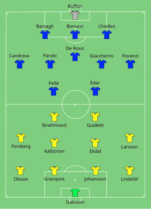 Italië won haar eerste groepsduel met 2-0 van België. De Italianen kwamen op 1-0 nadat Emanuele Giaccherini op links de bal kreeg aangespeeld van Leonardo Bonucci en die vervolgens in de verre hoek schoot. Graziano Pellè zette in de blessuretijd de eindstand op het bord door een voorzet van Antonio Candreva met een volley in het doel te schieten. Italië versloeg vier dagen later ook Zweden. Ditmaal was één doelpunt in de 88e minuut van de wedstrijd genoeg: 1-0. Giorgio Chiellini nam een inworp die invaller Simone Zaza links voorin doorkopte naar Éder. Hij bleef al dribbelend richting de rand van het strafschopgebied Victor Lindelöf en Oscar Lewicki voor. De daar wachtende Andreas Granqvist greep niet in en Kim Källström was te laat terug om Éder te verhinderen de bal rechts van Andreas Isaksson in het doel te schieten. Daarmee was Italië na Frankrijk als tweede land op het toernooi zeker van de achtste finales. Toen België een dag later Ierland versloeg, was Italië op basis van het onderling resultaat ook zeker van groepswinst. Met een op negen posities gewijzigd elftal gingen de Italianen in hun laatste groepsduel vervolgens met 0-1 onderuit tegen Ierland. Robbie Brady maakte in de 85e minuut het enige doelpunt van de wedstrijd. Hij kopte ter hoogte van de strafschopstip een hoge bal van Wes Hoolahan langs de uitkomende Salvatore Sirigu.